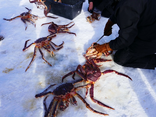 帝王蟹原產於俄羅斯堪察加半島的北太平洋,後由蘇聯科學家引入北歐海域。由於缺乏天敵,其數量迅速增加,對當地生態造成影響,因此部分保育人士主張清除。然而,對少數挪威漁民而言,帝王蟹則是珍貴的經濟來源。挪威政府嚴格管控捕撈,只發放少數執照。帝王蟹的蟹腳展開可達1.8米,重量可達10公斤,體型驚人。 體驗捕撈帝王蟹時,遊客需穿上禦寒裝備,搭乘導遊駕駛的雪上摩托車牽引雪橇(每輛8~10人),前往冰封的海面。抵達後,利用工具鑿洞,拉起預放的捕蟹籃,檢視當日漁獲。隨後返回木屋餐廳,現場烹調品嚐新鮮的帝王蟹,