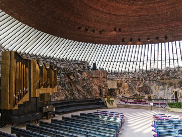 是一座融合自然與現代建築藝術的傑作,也是赫爾辛基最受歡迎的觀光地標之一。教堂建於天然花崗岩中,整體結構直接從岩石中鑿出,宛如地底湧現的聖所。圓形銅頂搭配中央天窗,使陽光灑落在簡約內部,營造出莊嚴又寧靜的氛圍。教堂內無柱設計與岩石牆面形成極佳音響效果,因此也常作為音樂會場地使用。儘管外觀低調如碉堡,內部卻意外明亮開闊,是一處結合信仰、藝術與自然力量的心靈空間。來訪赫爾辛基時,不妨靜靜坐在這片岩石之中,體驗一場與自然共鳴的心靈對話。